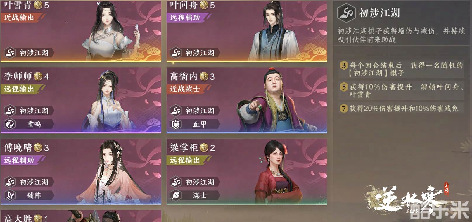 这儿有您【初涉江湖】遇到的伙伴与冤家,问舟师兄和雪青师姐也将陪您作战,还有李师师、傅晚晴、高衙内......Ta们聚在一起将持续吸引一位伙伴前来助战,正如其羁绊名【初涉江湖】,很适合新手玩家使用。