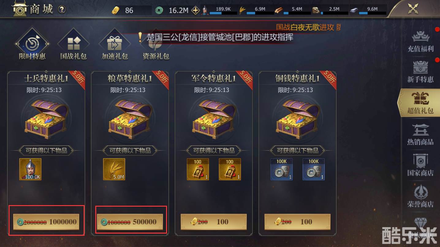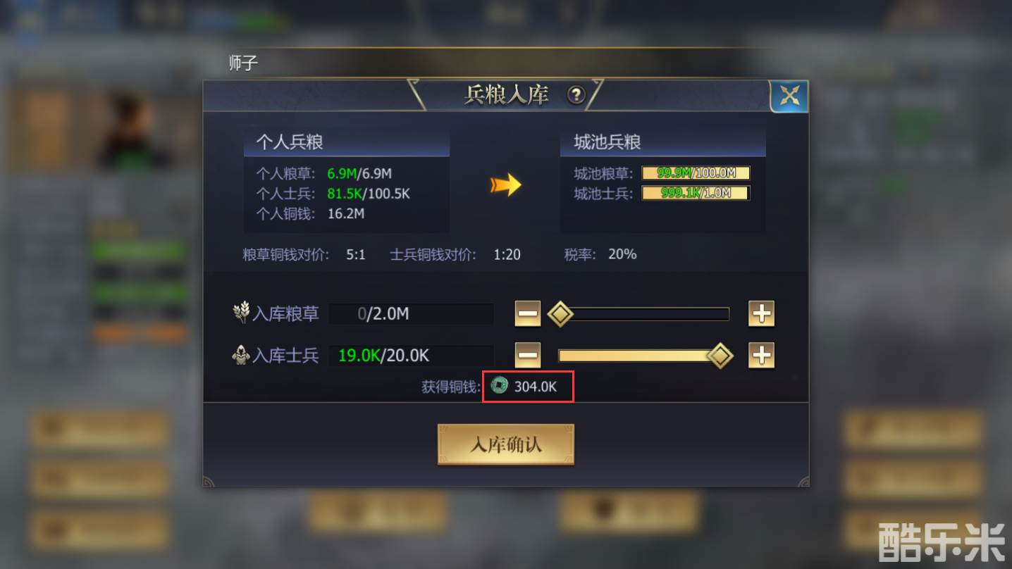 1.每天商城的国战资源,半价粮草跟士兵都是可以用铜币购买的,而且这些你是可以赚钱的,所以每天买满,买到的兵粮都会放在你所在势力的都城,同时兵粮是在你的个人仓库里面的。将购买的兵粮入库就能够换取铜币,这是铜币获取的方式之一。