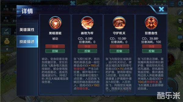 张飞没有法力值,取而代之的是狂意值。张飞每次普攻都可以获得少量狂意值,变身后每次释放技能都可以造成范围减速效果,并能够提高普攻的伤害。张飞虽然是坦克英雄,但在开大之后会拥有不俗的输出能力,同时可以极大干扰敌方的团战的阵形。
