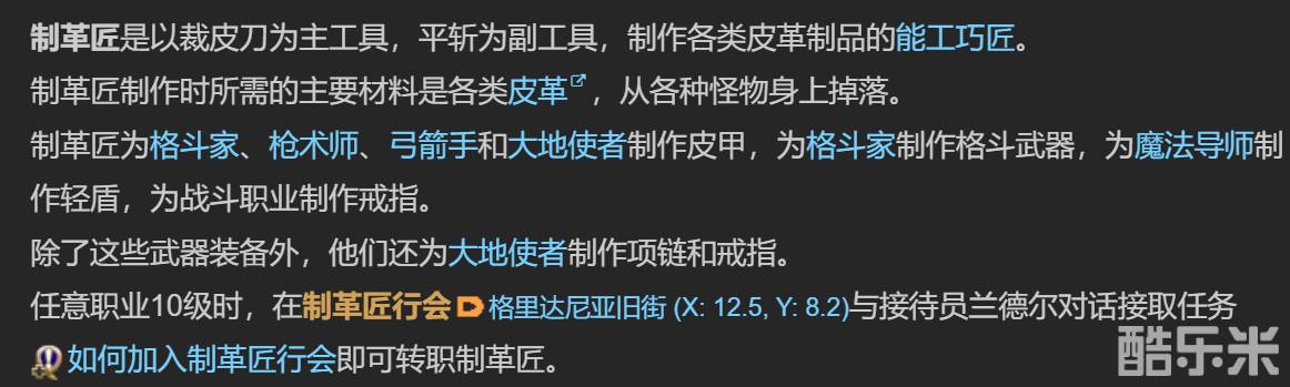 制革匠在游戏中是一个能够制作各种皮革用品的工匠,成为制革匠后可以给枪术师、格斗家、大地使者以及弓箭手等职业制作各种皮革,想要成为制革匠的话,玩家等级首先要提升到10级,然后千瓦给格利达尼亚旧街的制革匠行会找到兰德尔对话,完成制革匠任务,才能成为制革匠。