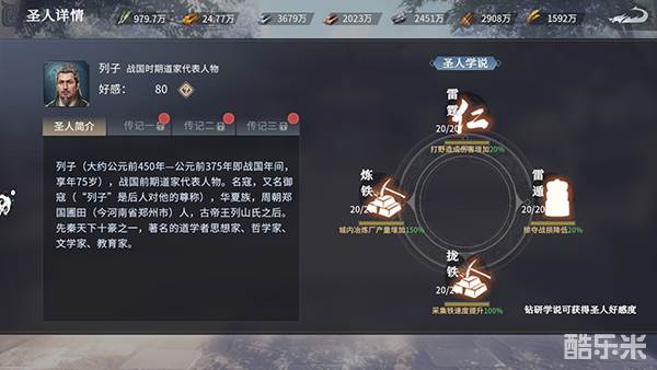 将列子学说钻研至满级,即可使主公在攻打时,对九州散布的蛮族、乱军、盗贼的伤害增加20%;主公在进攻其他主公的时候,战损率可降低20%;外出掠夺资源时,九州的采集铁速度增加100%;城池内的冶炼厂每小时产量增加150%。