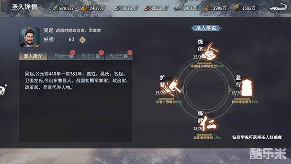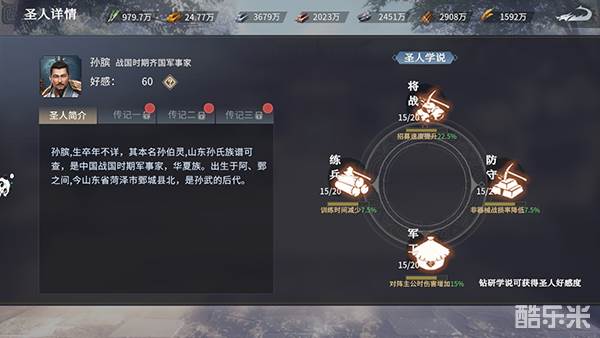 在兵家学派中,主公可解锁两位兵家代表人物分别是:孙膑与吴起。圣人的传记解锁可通过钻研学说进行,每位圣人的技能各有不同。下面和酷乐米小编一起来看看吧