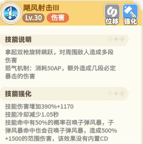 飓风射击 推荐:15-7-3。怒气机制会造成几段必定暴击的伤害,再加上位移和50%概率召唤子弹风暴(子弹风暴也能召唤子弹风暴,叠叠乐了属于是),机制倍率都堪称完美。