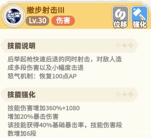 撤步射击 推荐:15-10-3。双枪核心技能之一,回怒气的神,没有任何先置条件,打了就回,被动自带爆伤,技能还自带基础暴击率,双枪段数最多的技能,倍率奇高,毫无短板。