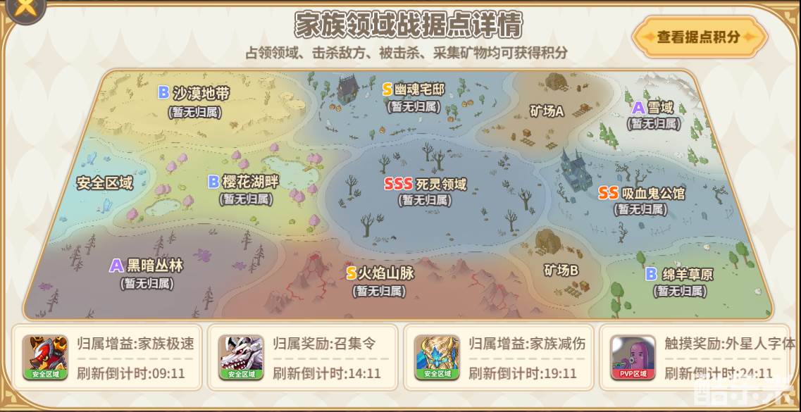 家族领域战分为安全区域、PVP占领区域、矿场区域、域外入侵区域这四部分区域组成,下面和酷乐米小编一起来看看吧