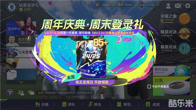 “周年庆典·周末登录礼”于6月20日新版本正式启动,即日起至7月13日,每周末任意一天登录可领取1个【85+】球员包 。