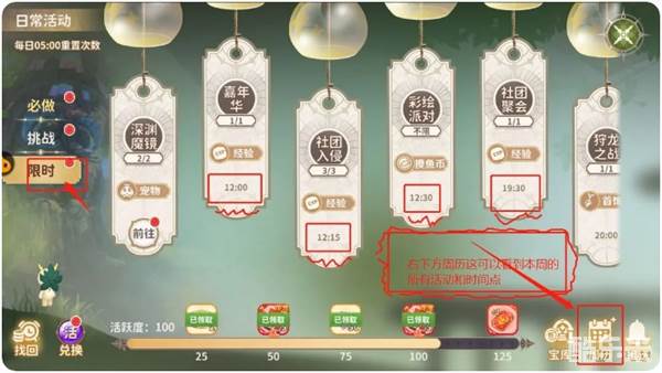必做和挑战任务每日是限制次数的,但限时任务是固定时间的,到时间都可以做,在右下方周历中可以查看本周所有活动时间和内容。