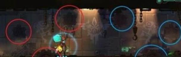 2、在第一关的这个区域,攻击两侧的四个开关,点亮蓝圈内的四盏灯,就能打开隐藏地图,获得隐藏武器图纸-“教学刑具”。
