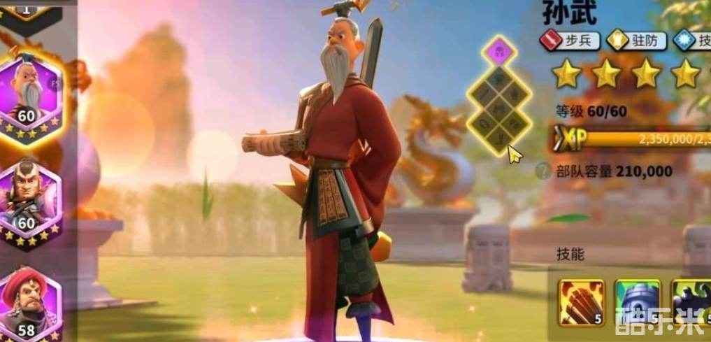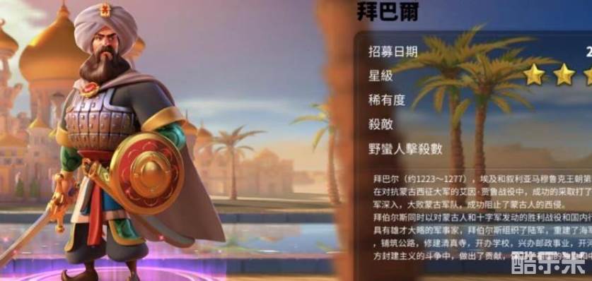 紫色武将的强度不如橙色统帅,但是在前期可以免费获得,是新手玩家推图时必须要利用上的。最值得培养的为拜巴尔,如果玩家选择阿拉伯作为起始文明,就能直接得到。他拥有固定百分之二十的骑兵攻击加成,在离开战斗十秒钟过后,行军速度还能提高百分之八十。本身的速度就很快,加上主动技能可以减少最多五个目标的移动的速度。这就让其基本上没有追不到的敌人,被追的时候也会有更大概率逃脱。下面和酷乐米小编一起来看看吧