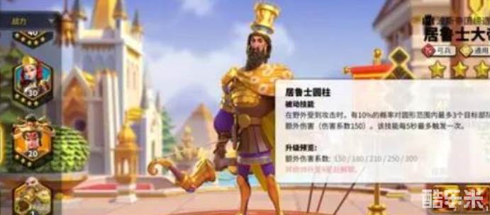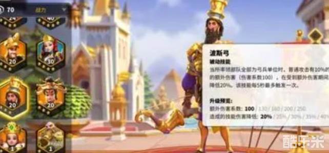 居鲁士大帝是第四代的步兵武将,核心主动技能为长生军,所需要耗费的怒气值为一千点。效果是对当前目标部队造成一次系数为一千四的直接伤害,并在接下来三秒内让其受到的伤害额外提升。在相同定位的武将里面伤害算是中规中矩,不算特别出彩,但是也勉强够用。不过技能里的增伤加成,会在一定程度上提升自己三技能与四技能的伤害。在围殴目标的时候,还能够让队友也享受到该加成。下面和酷乐米小编一起来看看吧