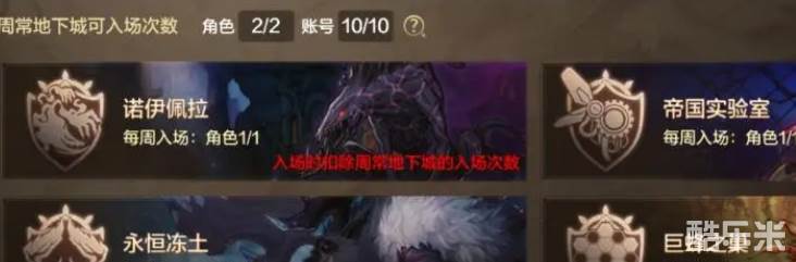 3玩家可以看到委托页面新增4个周常地下城,每个角色每周最多可进入其中2个,也就是4选2。全账号一共可以入场10次,每个地下城每个角色限挑战1次。