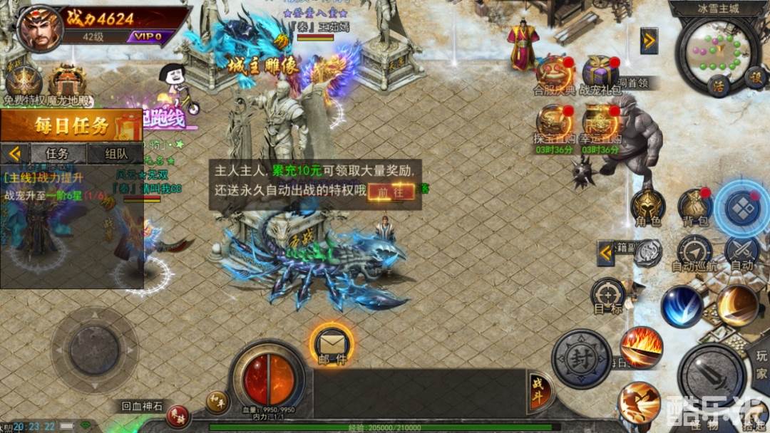 【开服狂欢,战宠助力)新人进服,小秘送真充,领取免费周卡,副本一键扫荡!收服冰雪魔晶蝎,辅助麻痹,杀怪以一当百。进入练功房自动打坐,泡点经验直升百级。冲击跨服巅峰赛,勇夺赛季冠军,穿戴王者剑甲!
