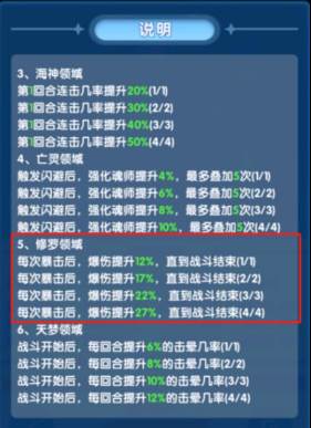 3)修罗领域加成极大,为了避免每次去刷修罗领域,建议平时4大领域中至少留一个位置给修罗领域,其他的选择上就根据自己的武魂搭配来,这样就不需要每次进行调整;