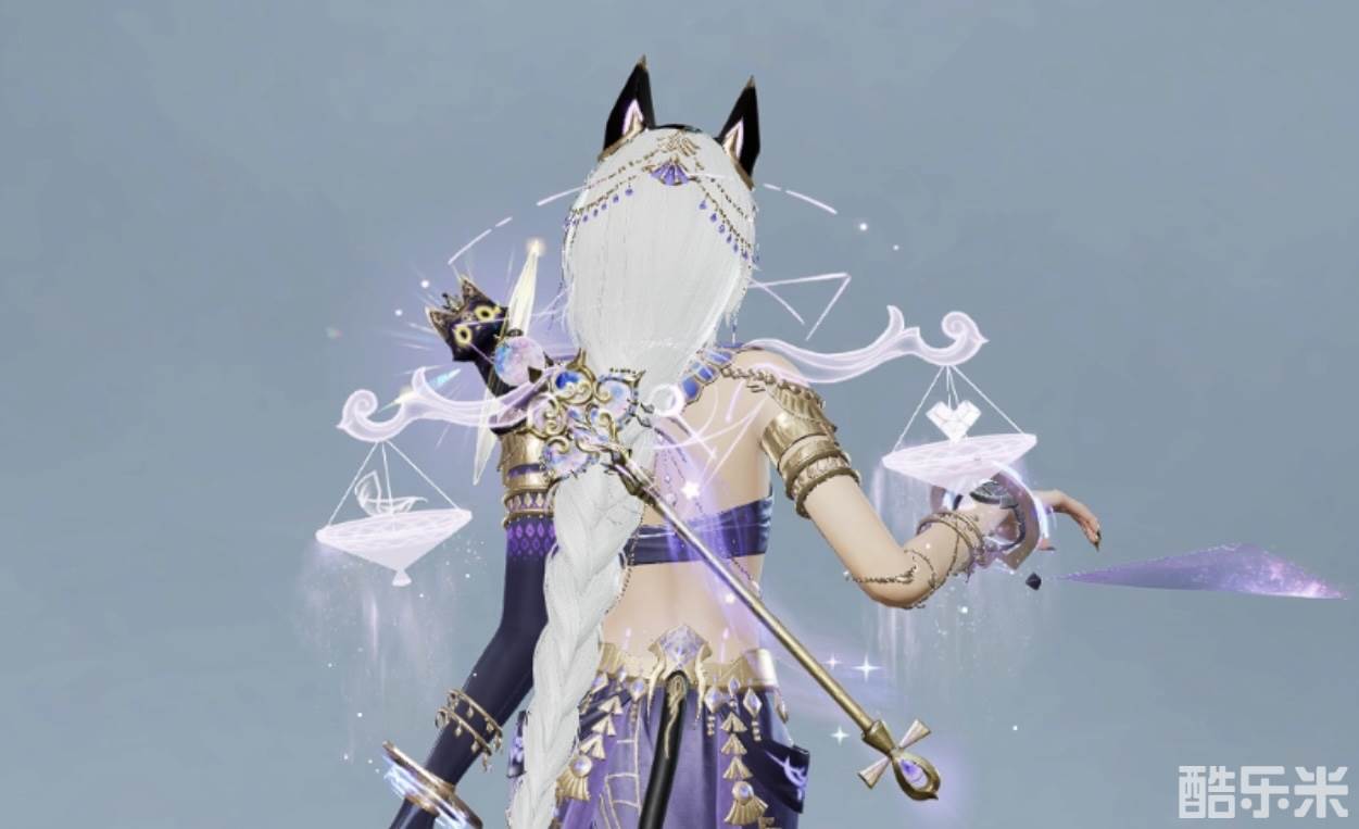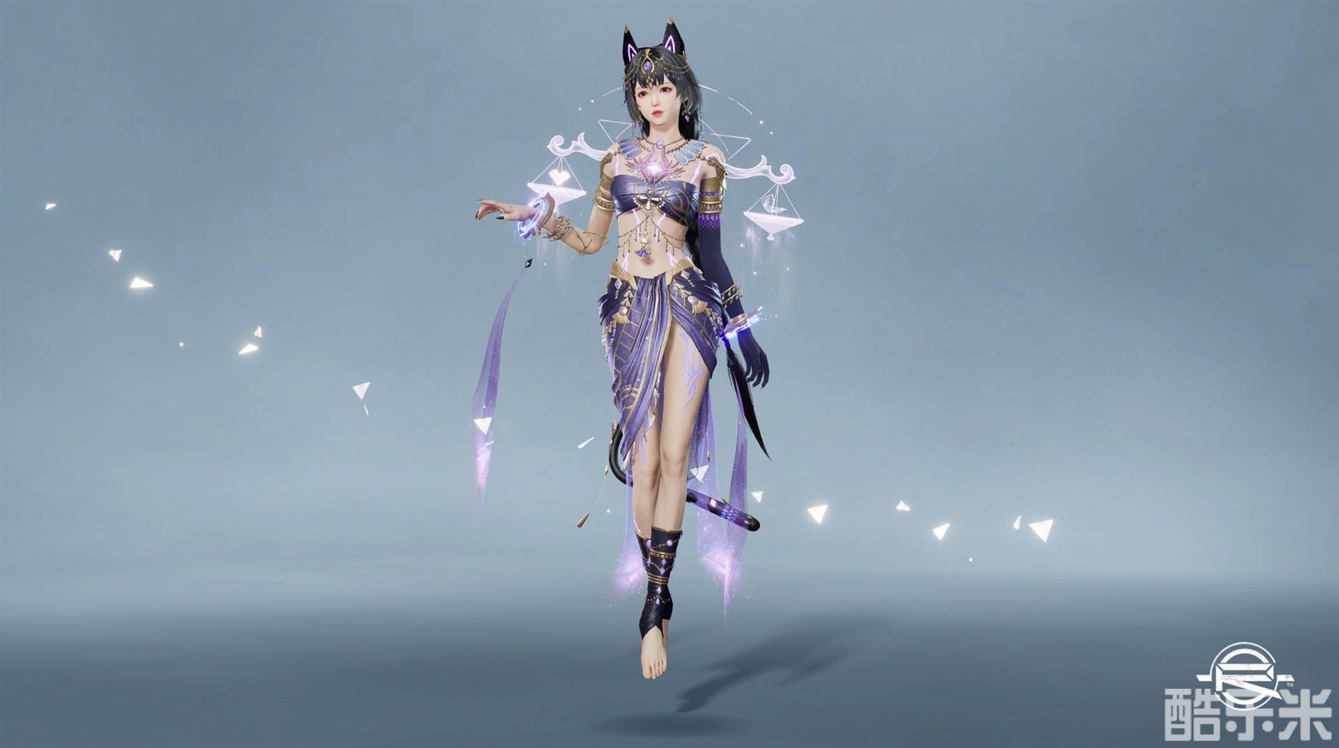 女款整套造型以紫色为基调,全身辅以各类金属配饰。抹胸上衣搭配开叉长裙设计精致,裙摆随步伐摇曳生辉,每一步都踏碎星芒。黑色+猫尾猫耳元素自带神秘与魅惑双重属性,发光天秤在背后显现,无一不缔造着星际祭司的永恒信仰!