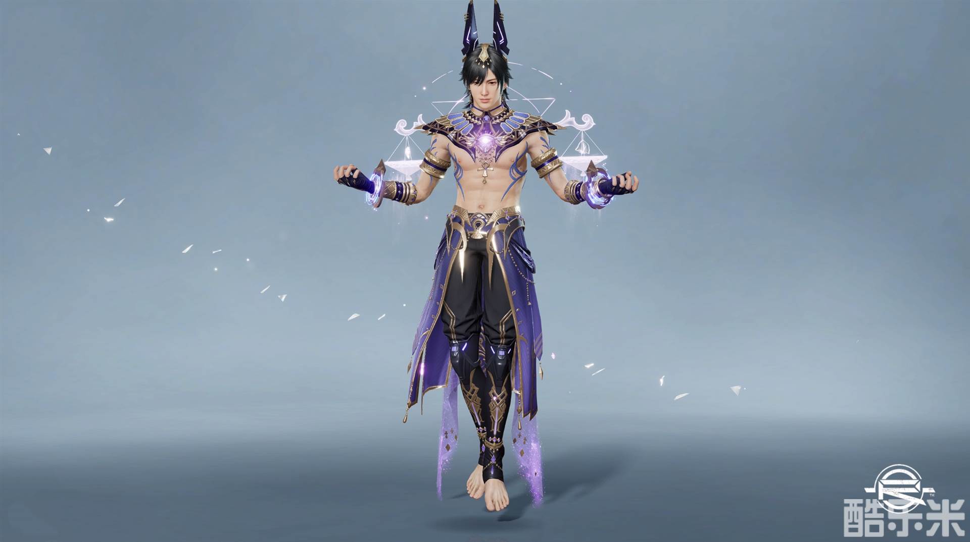 男款时装设计同样以紫色为主,敞开的胸口两侧处浮现紫色神经脉络,手部环绕的金色项圈似封锁着古老的咒语,隐隐有暗芒在纹路间流动。腰间镶嵌金色配饰,下身搭配一条印有金色云纹的暗紫色裤子,仿佛传递出无穷的能量与神秘力量。