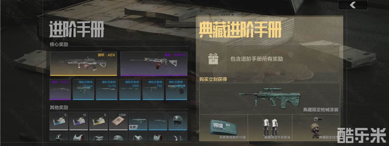 手册内除了大量枪械涂装和套装券外,依旧会有1200装扮券可供先锋们解锁获取,同时解锁进阶手册可获得金色品质枪械涂装【旗帜·AEK】,解锁典藏进阶手册获得典藏限定外观套装【行走深空机能套装】!