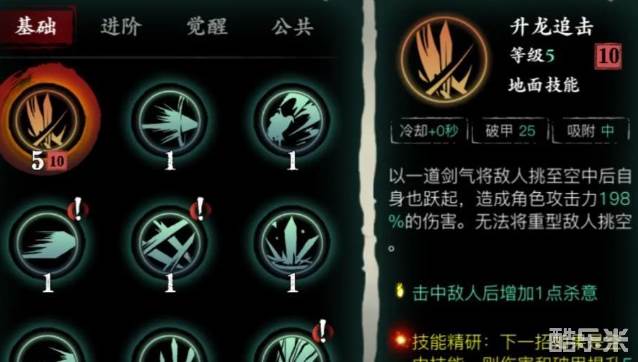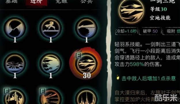 伤害倍率比较一般,会使用出三道飞行剑气,穿透路径上的敌人并造成五十点破甲的伤害。还会增加一点杀意,可以为后续的高伤害技能攒能量值。该技能不需要精研,主要是为了远程攻击敌人的效果。在开局的时候不用与boss贴脸,先站在比较安全的远程位置,朝着其方向释放一个一剑三绝,先附带上破甲的减益效果。
