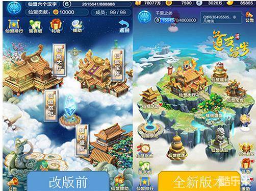 本次改版,整个仙盟的页面进行了调整,变得更加清新宜人。海外仙山漂浮于九州之上,仙盟大厅居中鸟瞰神州美景,其他的建筑则星罗棋布,别有韵味。而新增的玩法都置于这些新添加的建筑中,归类齐整,方便道友们使用。