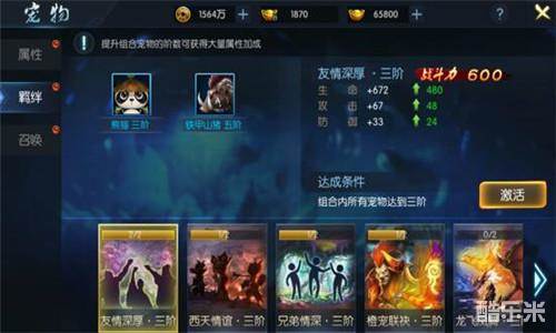 在《御龙传奇》中,不同宠物之间的情谊羁绊还能为玩家提供不俗的属性加持,获得特定的宠物即可激活该羁绊。一般来说,品阶越高的宠物能够提供越强大的属性加成,如熊猫与铁甲山猪可激活【友情深厚】羁绊,提供攻防生命值加成;牛头人与孙悟空可激活【兄弟情深】羁绊,提供攻防生命值与真实免伤加成;冰晶凤凰与翼龙可激活【龙飞凤舞】羁绊,提供攻防生命值与真实伤害真实免伤加成。当玩家达成羁绊升级的条件时,还可提升羁绊的阶级,获得更高的属性加成。