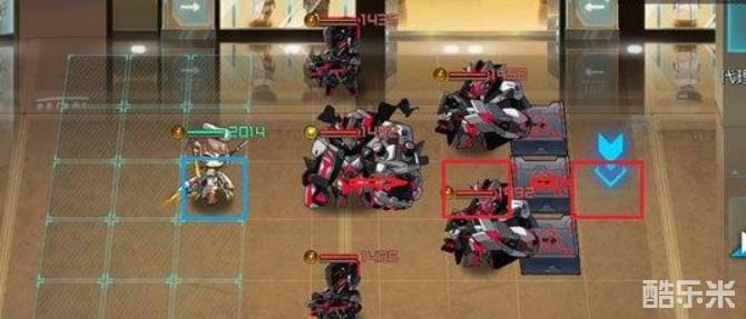 沐子菲在下图位置部署,使用【绝云突击A】移动到中间怪后面一格(如下图第一个箭头),然后再次使用【绝云突击】到达障碍后一格(第二个箭头)即可通关。