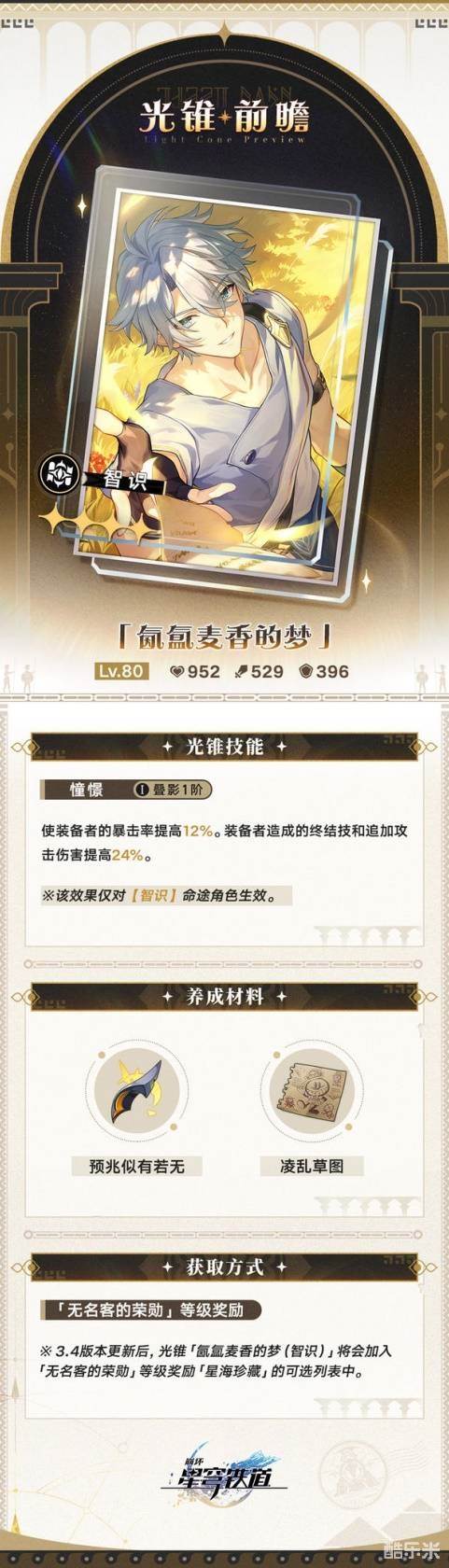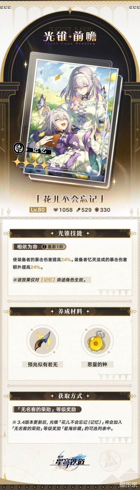 崩坏星穹铁道3.4新增了哪些大月卡光锥,3.4新增了多张无名勋礼可以获得的新光锥,「无名勋礼」的自选光锥奖励将由8张扩充至16张,下面和酷乐米小编一起来看看吧