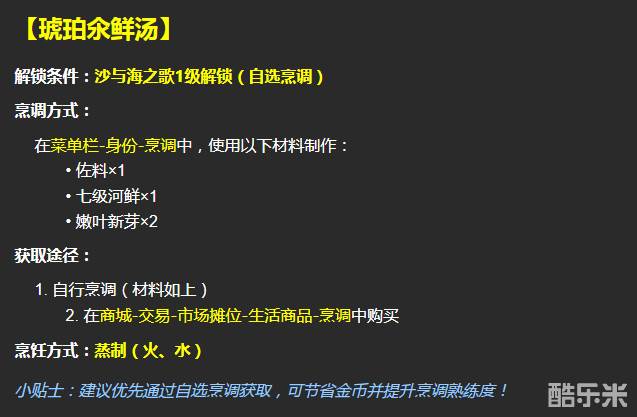 在逆水寒手游中,琥珀氽鲜汤需要沙与海之歌1级解锁,在菜单栏-身份-烹调中,使用以下材料制作:佐料x1、七级河鲜x1、嫩叶新芽x2,下面酷乐米小编给大家带来了《逆水寒手游》琥珀氽鲜汤配方及材料获取方法,感兴趣的小伙伴们一起来看看吧。
