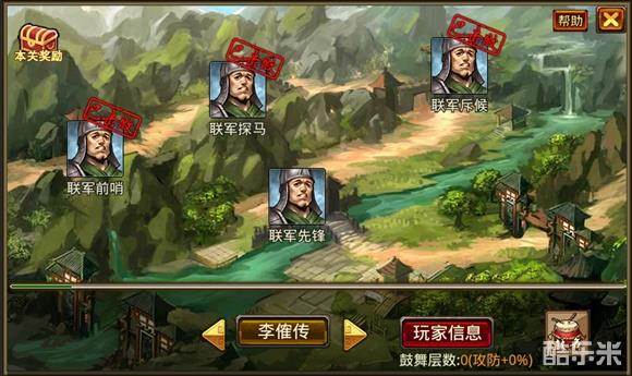 2.过关斩将有很多关卡,每个关卡有30名守兵与1名守将,玩家只需击败某一关中的守兵就能通过本关,可领取本关通关奖励,并可挑战下一关;