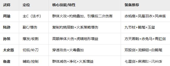灼烧联动:周瑜群体挂火→陆逊复制层数→孙策引爆,三层灼烧后触发真实伤害。