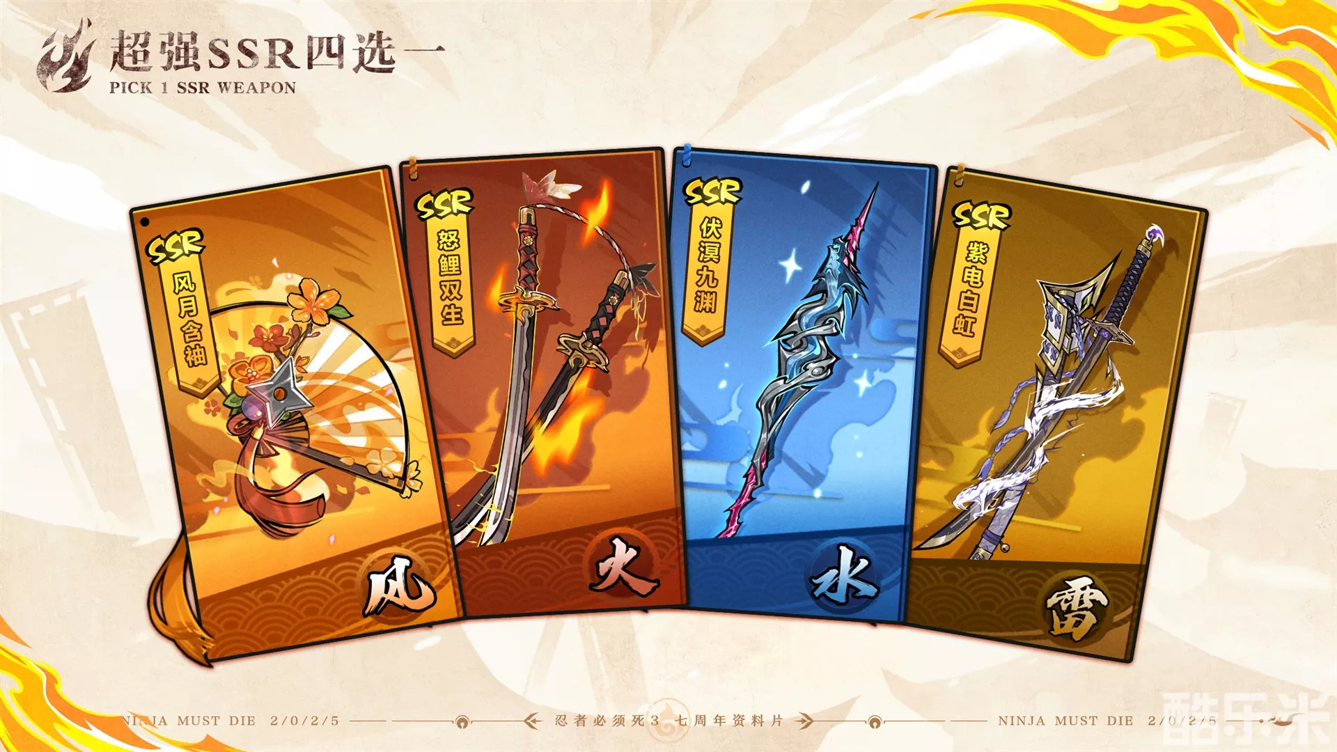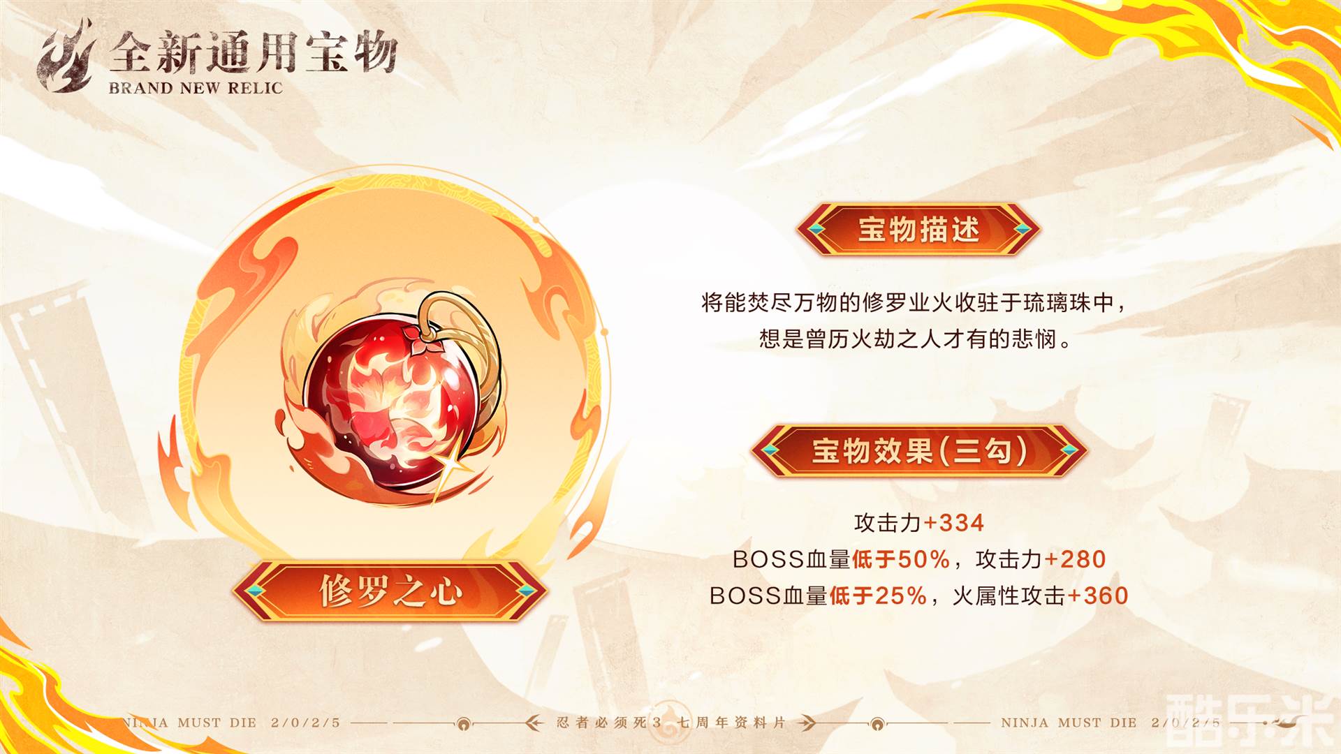 忍者必须死3七周年庆典资料片有什么,忍者必须死3七周年庆典资料片「神炎铸赤心」已经正式上线!这次将会上线全新通用宝物「修罗之心」现世,其中四把SSR神兵玩家可以任选其中之一!下面和酷乐米小编一起来看看吧