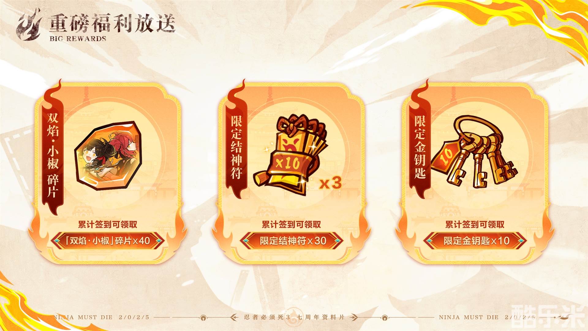 「神炎铸赤心」福利签到上线,连续登录可获得「双焰·小椒」角色碎片*40、限定十连结神符*3、限定十连金钥匙*1等奖励!