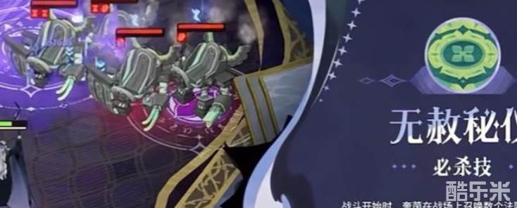 1、无赦秘仪必杀技战斗开始时,奎茵在战场上召唤数个法阵,每个法阵累计获得一定能量后会被点亮。法阵被点亮后法阵周围一定范围内的所有友军将回复生命值所有敌军急速降低。
