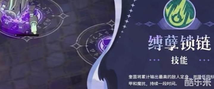 2、缚孽锁链技能奎茵将累计输出最高的敌人定身,并降低目标急速护甲和魔抗持续一段时间。场上每存在1个已点亮的法阵,持续时间均会得到延长。
