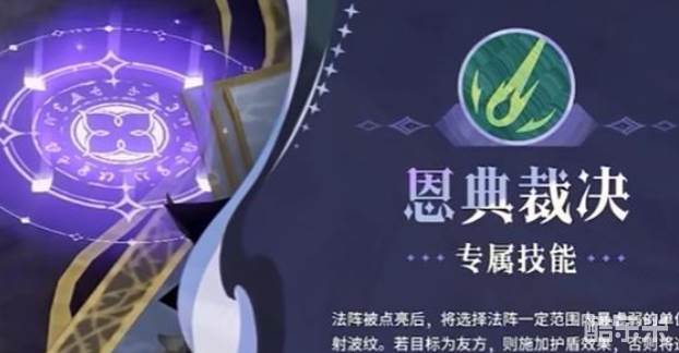 3、恩典裁决专属技能法阵被点亮后,将选择法阵一定范围内最虚弱的单位发射波纹若,目标为友方则施加护盾效果否则将造成伤害。