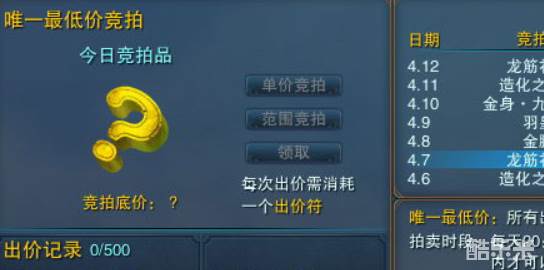 拍卖会上的没意见商品的低价都为1金币,玩家可以根据商品来自由加价,拍卖会会进行1个小时的时间,时间到了9点钟时,拍卖会会正式结束,在竞拍结束之前,只要玩家所报的竞拍价格比商会给出的低价高,而且你的竞拍价格还必须时全场竞拍价格里最低的,就能把竞拍商品给拿到手了。