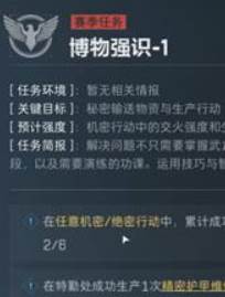 1、任务目标:在任意机密/绝密行动中,累计成功带出6件品质≥紫色的家居物品类收集品;在特勤处成功生产1次精密护甲维修包。
