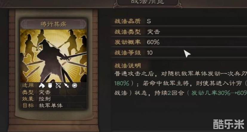 该战法兼具输出与控制能力,尤其针对主将依赖主动战法的队伍具备显著压制效果。搭配连击类战法可进一步提升触发频率,例如裸衣血战或强攻,通过增加普攻次数间接提高将行其疾的发动概率。