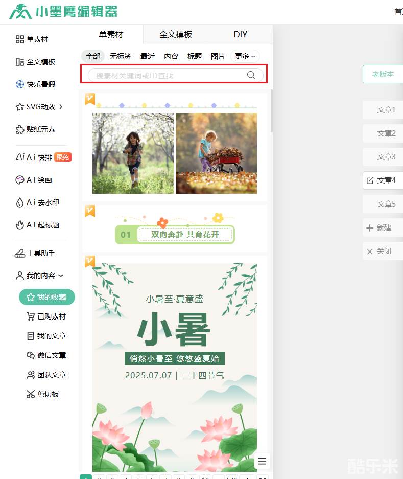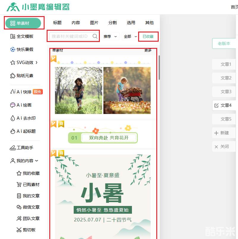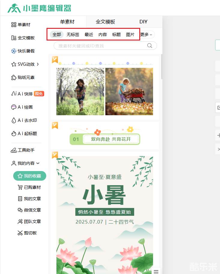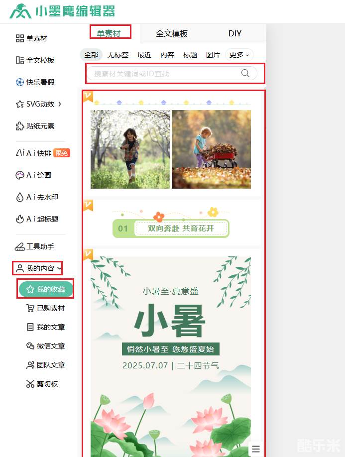 在微信编辑器中,当已收藏的单素材过多时,可按以下方法快速查找,提升效率: