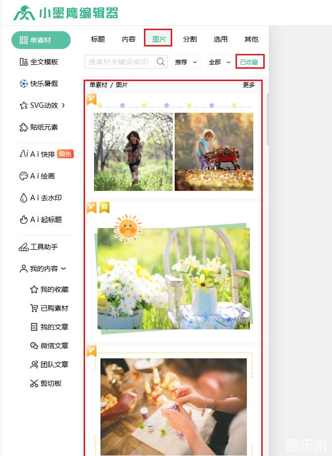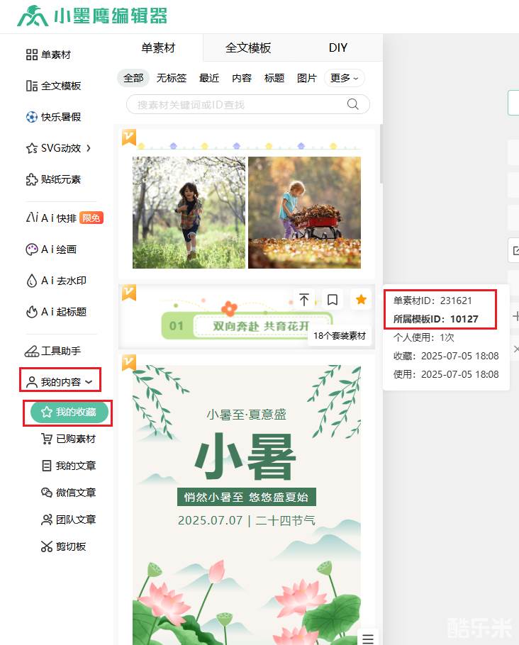 在单素材界面直接点击“已收藏”选项或点击“我的内容-我的收藏-单素材”,即可展示所有曾收藏过的单素材,便于进行整体浏览和初步筛选。在搜索框中搜索已收藏的单素材关键词或ID可以加速找到。