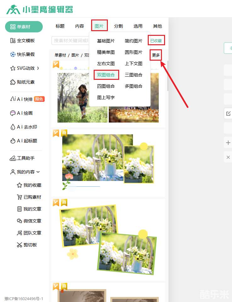 若遇到双图、多图素材因展示方式导致查看不便的情况,点击“更多”选项,能设置一页展示多行内容,让单素材预览更清晰直观。
