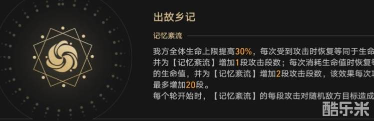 一种是提升己方全体百分之三十的血量上限,它比较利好缇宝、万敌以及遐蝶。第二种是受到攻击能恢复上限百分之五的生命,同时给记忆紊流增加一段攻击。消耗生命之时恢复上限百分之十的血量,同时给记忆紊乱增加两段攻击。该效果每次攻击仅能触发一次,最多能增加二十段。以上的受击回血每支队伍都能触发,仅仅需要挨打就能实现。而消耗生命回血更适合万敌这类的烧血C,没有烧血机制很难叠满二十段。