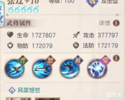 张辽还有一个特别的幻武,在经过升级之后,幻武能带来额外的攻击力和生命值,除此之外,还有很强的防御属性。能与张辽的技能搭配一起,特别是在使用怒气技能后,还附加百分之十几的伤害增益。对于张辽来说,这个幻武无疑是兼具防御与攻击的神器。