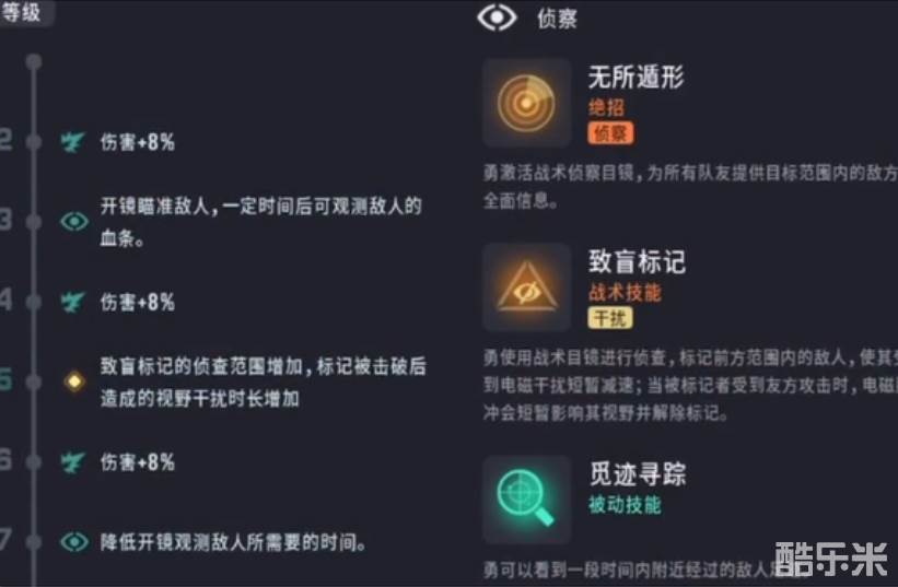 还有一个标记的功能,可以利用战术目镜,标记前方的敌人,还有一个电磁脉冲的干扰,可以使敌人丧失视野,游戏中还有一个大招技能可以提供范围内所有敌人的标记信息,为全部的队友,这个技能非常的关键,可以让队伍掌握到更多战局的信息。