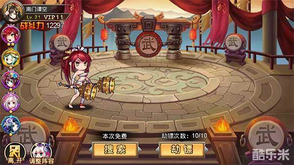 主公可以在“去劫镖”里面配置劫镖的阵容,进去点击--搜索去搜寻运镖的队伍,每天有10次劫镖的次数。