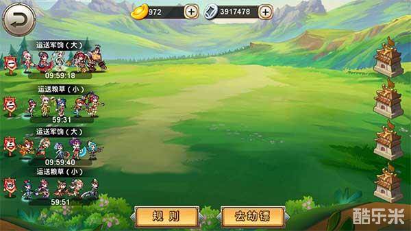 首先,主公可以选择“运送军饷”还是“运送粮饷”,然后开始选择运送大量或者是少量。(运送量越大,奖励越丰厚,但运送花的时间较长-----因为有被劫镖的危险)