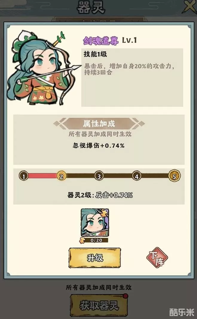 剑动追尊是新手完成“器灵觉醒”任务(主线到第5章)必给的,长得像个拿弓的小仙子,技能特别适合刷怪——“暴击后,增加自身20%攻击力,持续3回合”。新手初期主要做主线,比如“消灭10只野狗”“清理妖洞”,这些怪数量多但血少,需要快速清掉。剑动的技能刚好能放大“暴击”的效果:比如主角用“横扫”技能(有10%暴击率)打一群野狗,只要出一次暴击,接下来3回合的攻击都会加20%,本来打一下100血,现在打120,刷怪速度至少快25%。