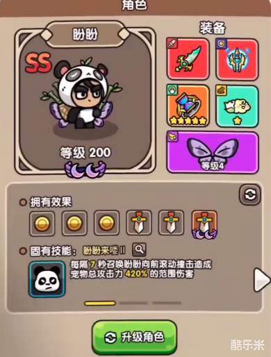 假如玩家想要的是一个,带有闪避或者是护盾类型的角色,那就可以选择盼盼,这个角色的外观形态也非常可爱,是一只大熊猫,每隔7秒钟的时间,就可以直接召唤这个角色向前滚动,这样角色会直接撞击对手,可以借助这种方式,带来所有宠物攻击力420%的范围伤害,非常适合用这个角色去参与竞技场,升级之后角色还有着较高的闪避能力。