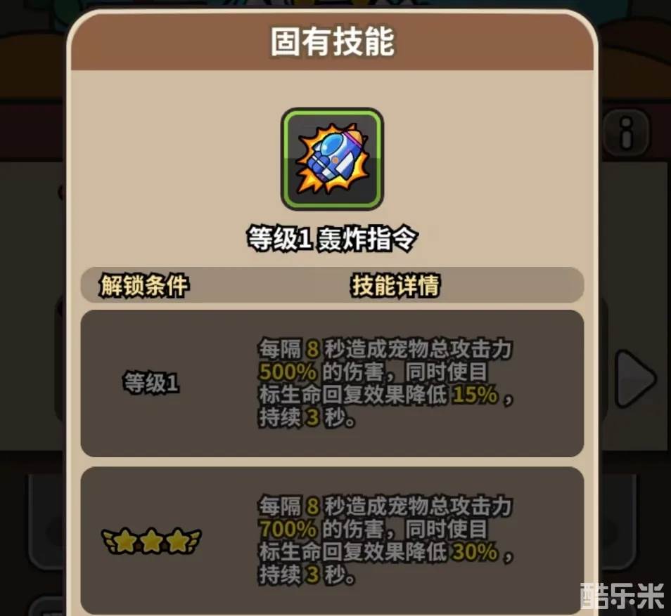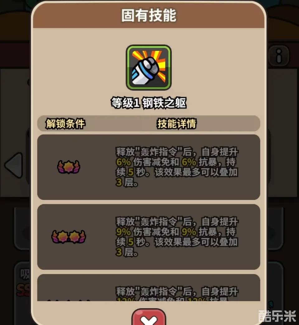 特殊效果:释放“轰炸指令”后,自身提升6%/9%/12%减伤和6%/9%/12%抗暴,持续5秒,可叠加,最多3层。