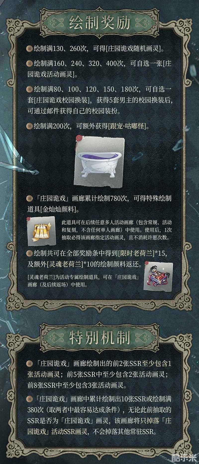 7月10日更新后 - 7月30日05:00,全新「庄园诡戏」活动卡池限时开启。活动期间,艾因SSR[坠时伪生]、路辰SSR[心渊渡梦]、罗夏SSR[明日将至]、司岚SSR[不归漫流]、叶瑄SSR[永无匣子]获得概率提升。卡池具备许愿功能,活动结束后,以上画灵暂无获取途径。