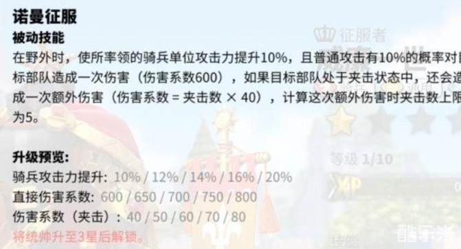 武将主要通过幸运转盘活动获取,三技能诺曼征服在野外可提升部队20%攻击力,并有10%概率触发800系数的额外伤害,若目标处于夹击状态则根据夹击人数追加伤害,上限5人。四技能北方浩劫在主动技能命中后提供20%防御加成与持续3秒的怒气回复,觉醒后骑兵攻击加成提升至50%且夹击系数提高到100,这些特性决定了其战术定位偏向中大规模野战场景。