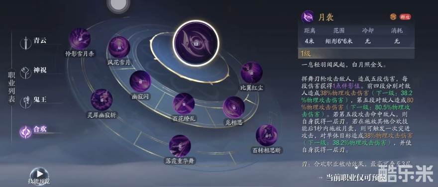 合欢的技能月袭,是一个没有冷却时间的技能,玩家若连续点击使用,不仅会产生一系列不同的动作,还会让角色向前进行一小段距离的移动,更为奇妙的是当连续使用四次后,在下次使用时便会造成额外的伤害,同时为自身附加一层刃,这层刃为后续的战斗增添助力,而且,合欢在使用其他技能之后,短时间内迅速接上月袭,月袭的效果会瞬间转变,从原本的小位移攻击变为向前冲刺,并再次获得刃效果,玩家们不妨好好利用这一妙招,在每个技能释放之后,若条件允许,尽量衔接一个月袭。